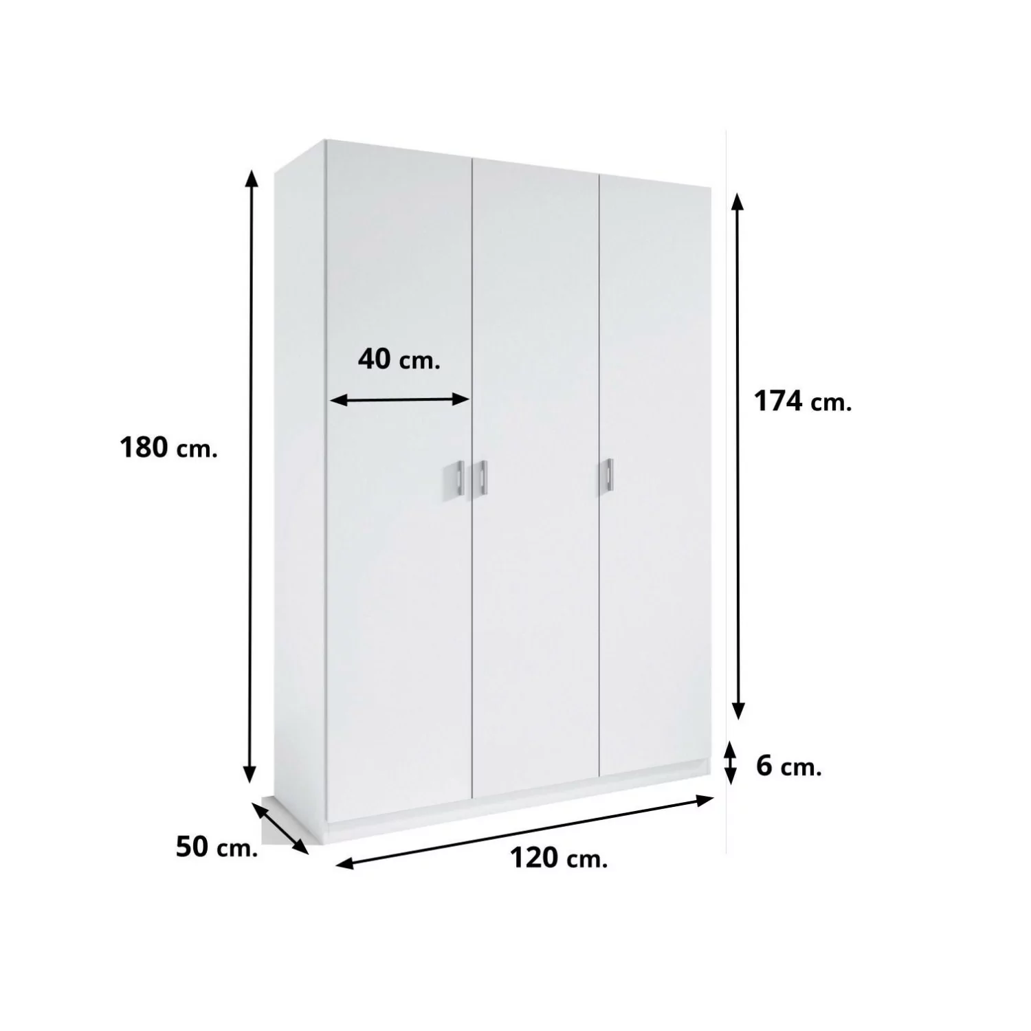 Porque nos gusta que te gastes muy poco dinero, hemos sacado a la venta este armario 3 puertas batientes de color blanco hielo de 120 cm x 180 cm de altura. Este modelo va dividido en el interior en dos partes por un tablero central para que puedas organizar tu ropa, una de estas partes está formada por un hueco de 80 cm con dos puertas y la otra parte la forma una puerta de 40 cm, en ambos lados lleva una barra de colgar en el interior.