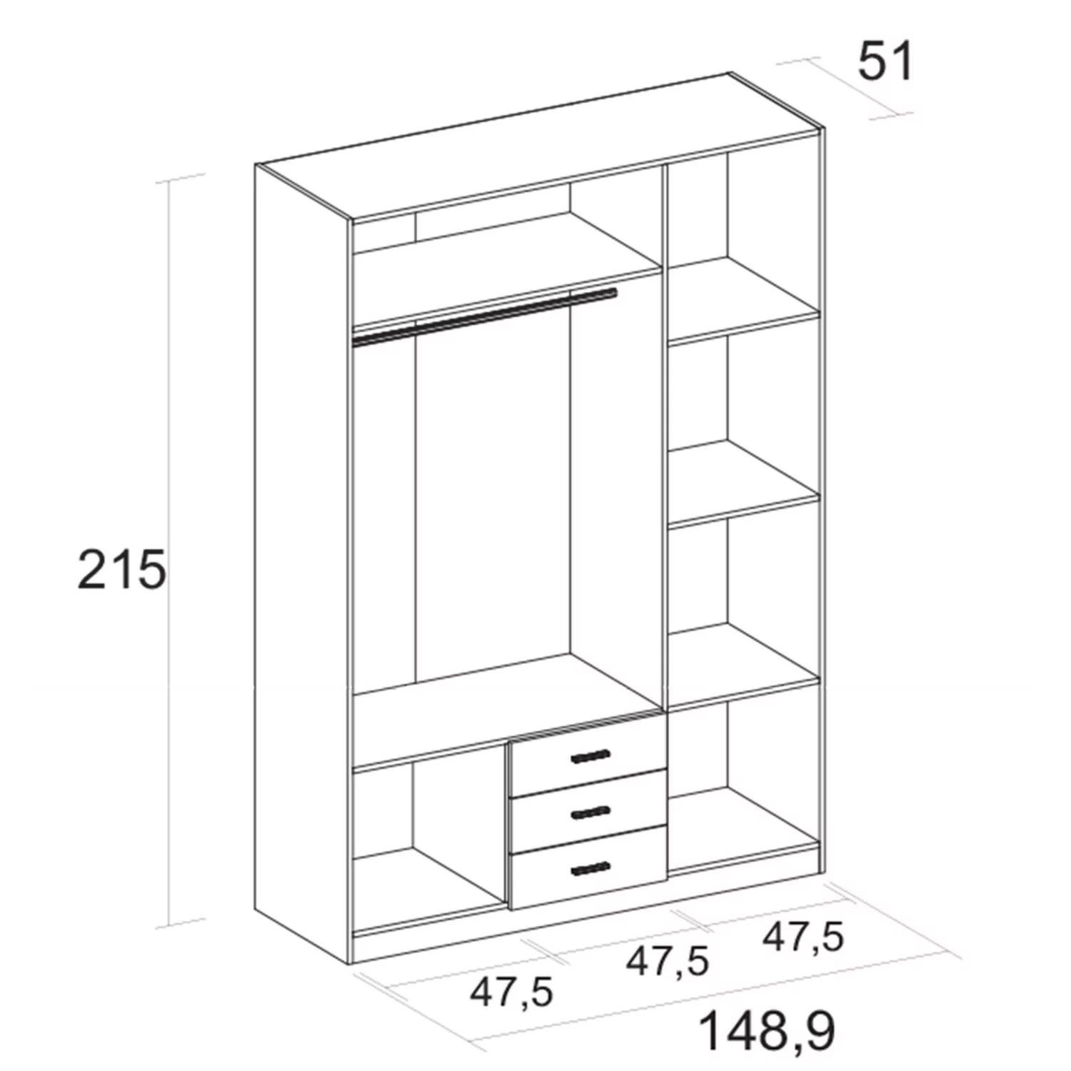 El interior consta de dos zonas perfectamente diferenciadas separadas por un costado divisor de arriba a abajo, en la parte de la izquierda lleva un estante maletero de 96 cm, una barra de colgar de la misma medida y un estante de 47.5 cm a la misma altura que los 3 cajones exteriores. En la zona de la derechalleva 3 estantes de madera de 47 cm. La parte exterior de este armario ropero lo forman dos puertas largas 47 cm, una puerta corta y 3 cajones con guías metálicas de 47 cm.