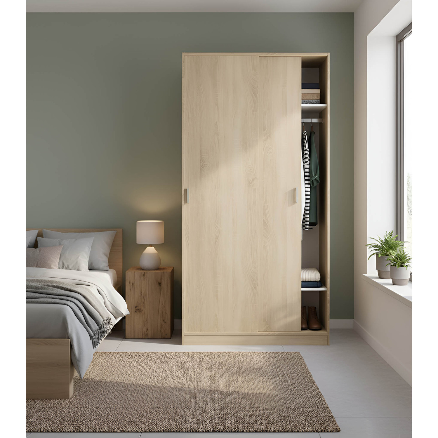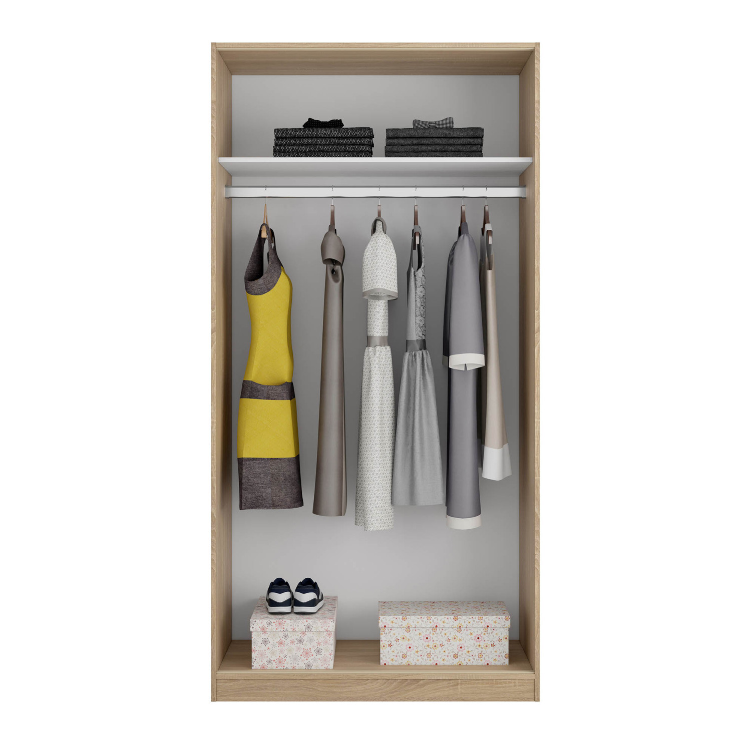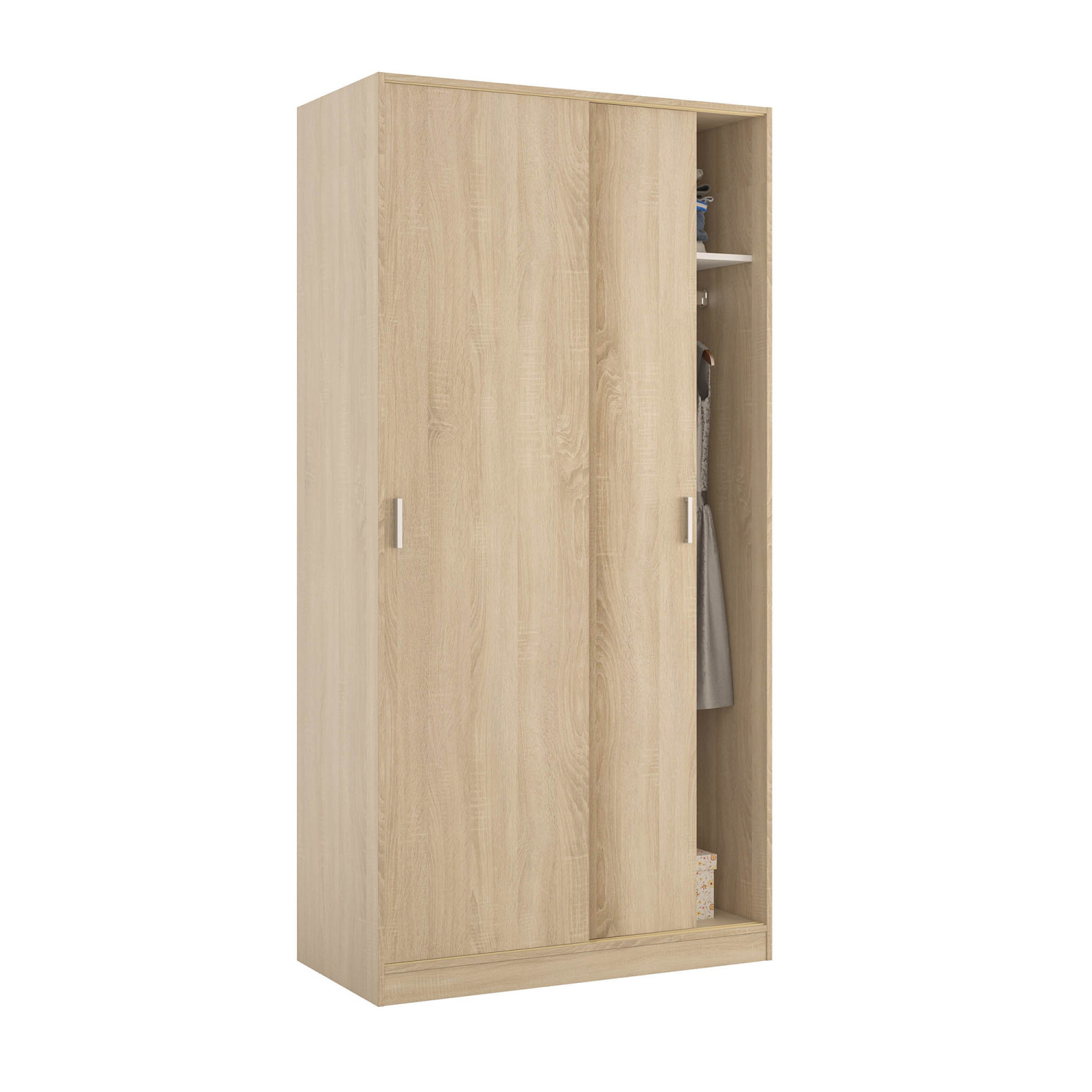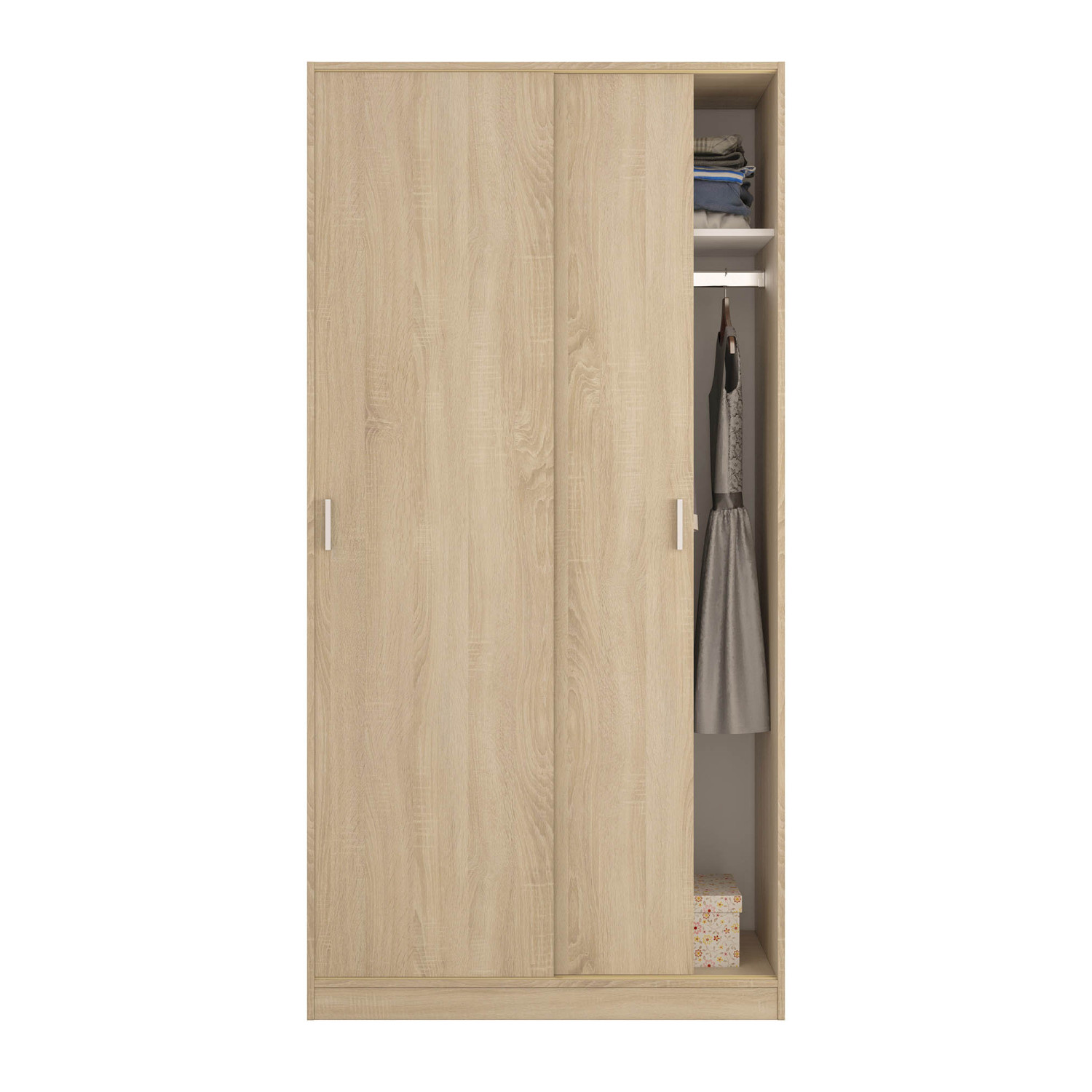 armario 2 puertas correderas y un estante en color roble con interior en blanco es perfecto para cualquier