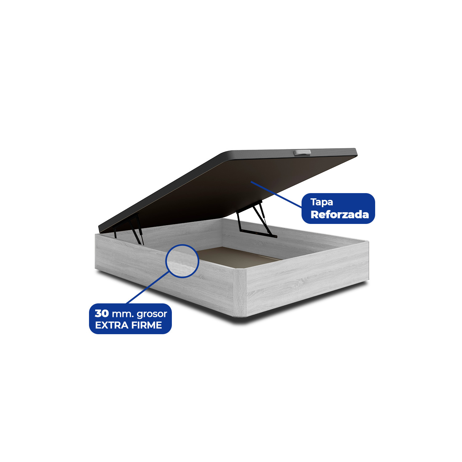 Tiene una estructura robusta fabricada con tableros de partículas de madera de 3 cm de grosor y recubierto de chapa sintética de alta calidad garantizando una vida útil y un soporte firme para tu colchón. Tiene dos esquinas redondeadas en madera en el piecero y un amplio espacio de almacenamiento en su interior con 27 cm, podrás aprovechar el máximo para organizar todo lo que necesites.