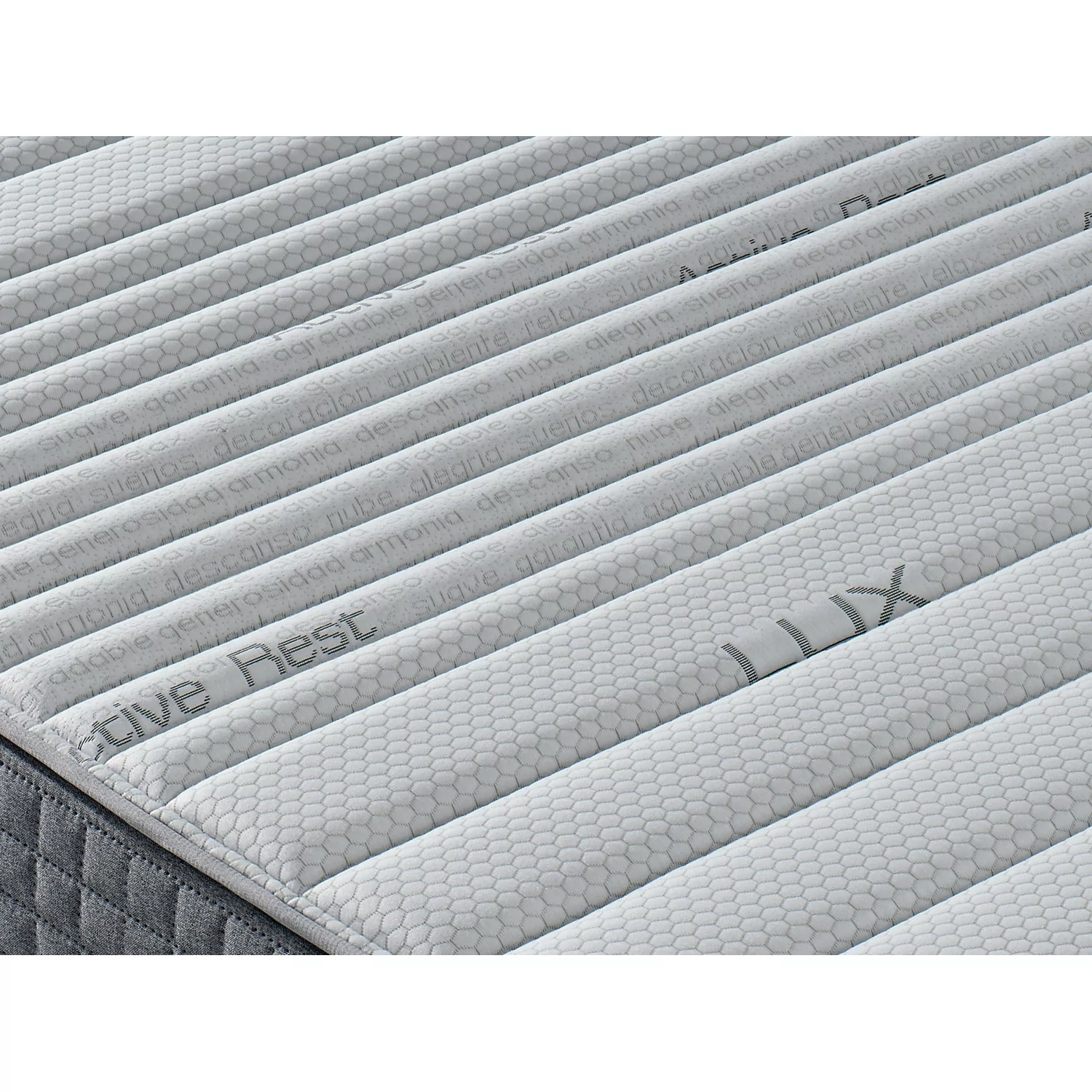 La platabanda que une los dos lados del colchón está tapizado en un gris claro con un dibujo acolchado a cuadros relleno de fibra de 200 gramos + forro de poliéster.