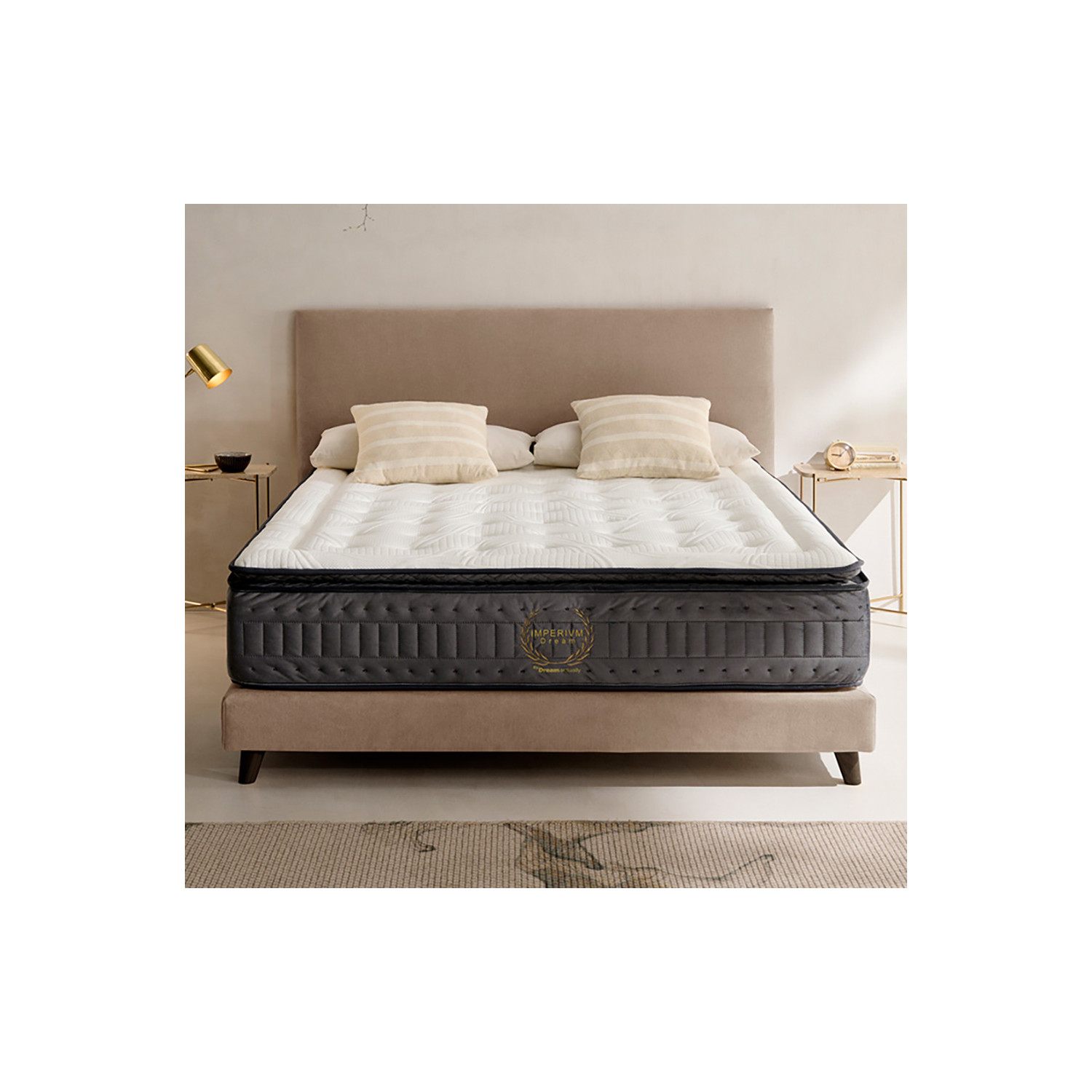 El colchón modelo Imperium tal y como su nombre indica destaca principalmente por su diseño elegante y moderno. No solo aporta un toque glamour a cualquier dormitorio, sino que refleja el nivel premium. Está fabricado con materiales de alta calidad y cuidando cada detalle para convertirlo en un colchón de gran calidad y con una durabilidad duradera. El núcleo del colchón está fabricado por muelles ensacados individualmente, que aseguran una adaptabilidad óptima y un soporte preciso. Esta tecnología permite una distribución uniforme del peso y minimiza la transferencia de movimiento.