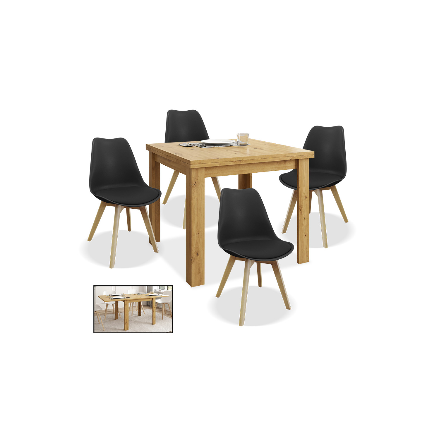 Conjunto de mesa cuadrada de comedor extensible en color artisan con 4 sillas de comedor . estilo nórdico fabricada en madera de haya natural con asiento y respaldo en color negro.