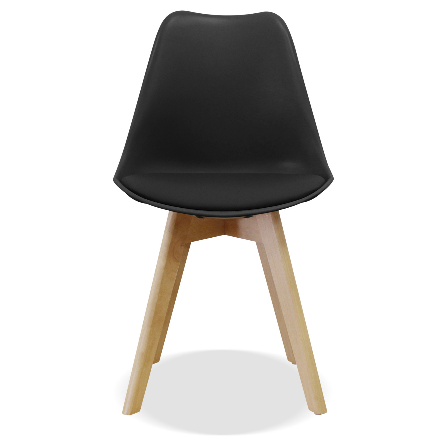 Acompañando la mesa, incluimos 4 sillas de comedor , de inspiración nórdica y diseño ergonómico. Su asiento y respaldo en una sola pieza están fabricados en polipropileno negro, un material resistente y duradero, mientras que el cojín acolchado del asiento en polipiel añade un plus de comodidad. Las patas inclinadas de madera en color haya natural no solo aportan estabilidad, sino también ese toque cálido tan característico del estilo escandinavo.