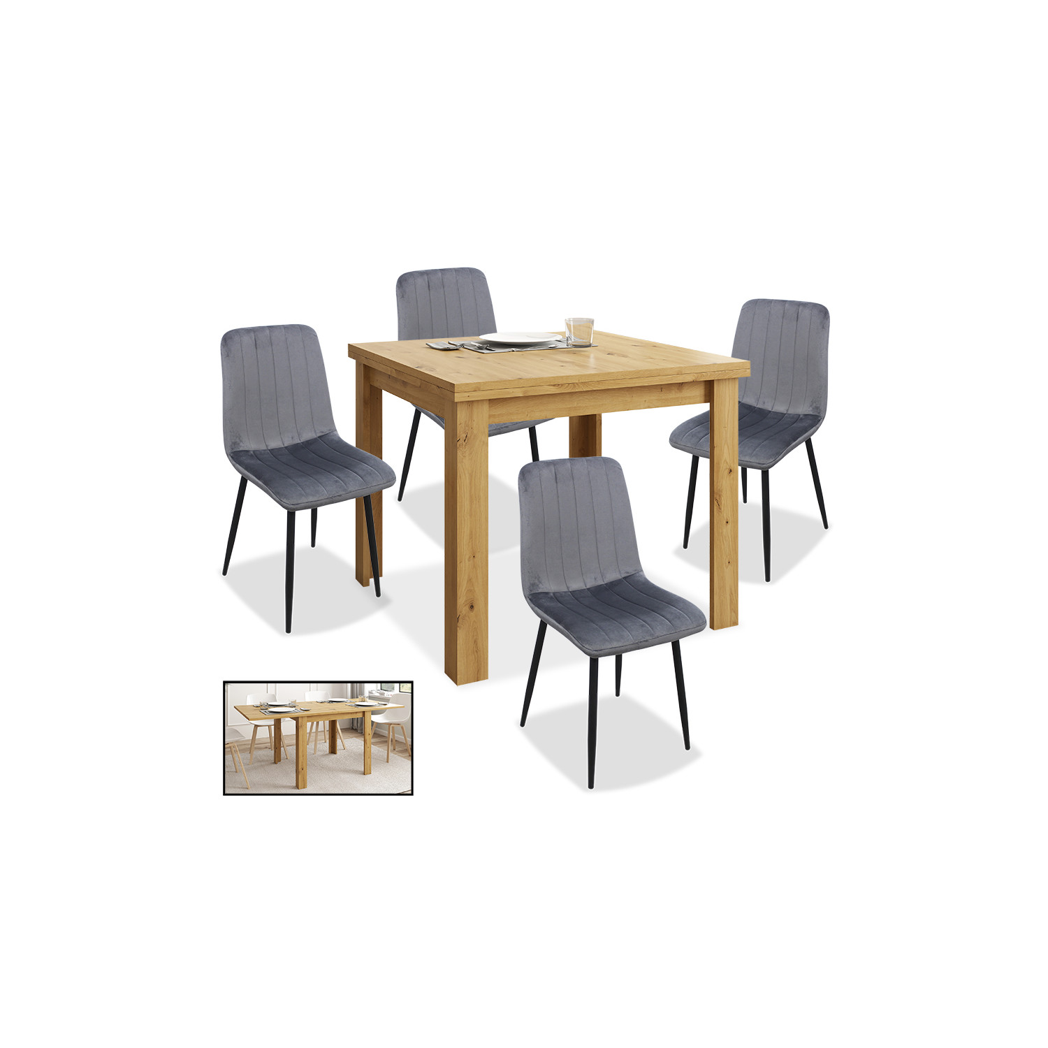 DESCRIPCIÓN GENERAL ¿Necesitas un conjunto de mesa de comedor y sillas? Si estás buscando un conjunto de comedor práctico para un salón pequeño o un piso de estudiantes este conjunto formado por la mesa extensible Tempo en color madera artisan y 4 sillas Cyrus en color gris es la opción perfecta. Su diseño, materiales y tonos hacen que encaje especialmente bien en ambientes de estilo rústico o natural, aportando calidez y un aire acogedor a cualquier estancia.