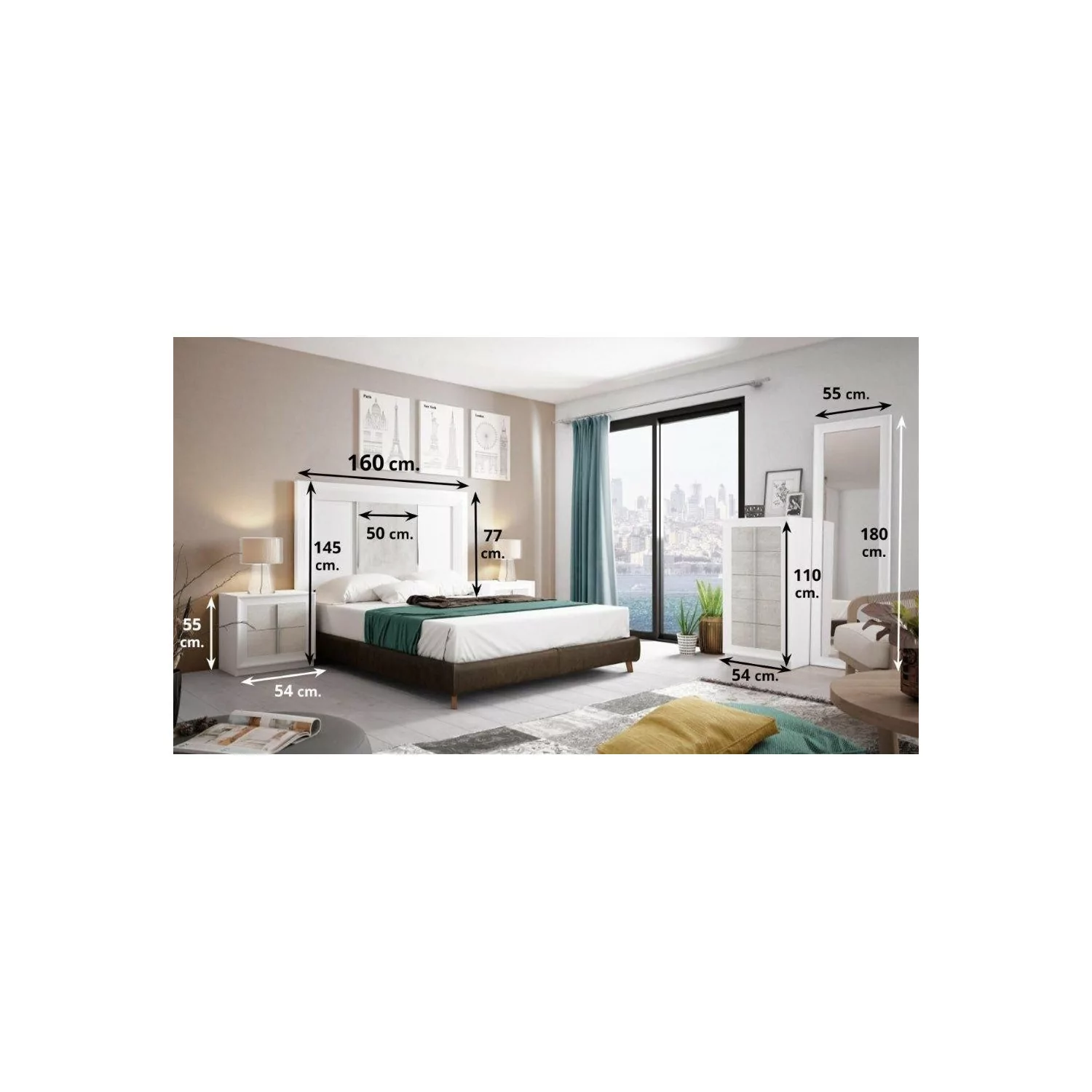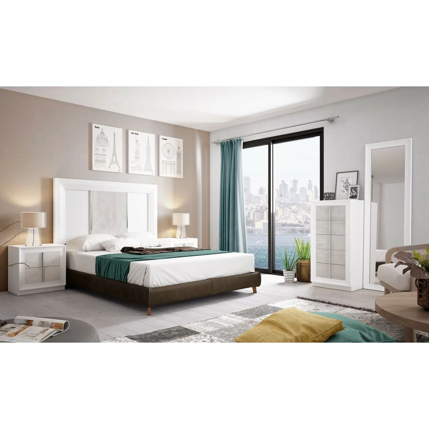 Este dormitorio de matrimonio compuesto por cabezal cama, 2 mesillas, sinfonier y espejo está fabricado con materiales de primera calidad con una terminación en color blanco veteado con detalles en color pozzolana (gris plata). Esta preciosa combinación de colores nos da amplitud y potencia la luz natural del día.