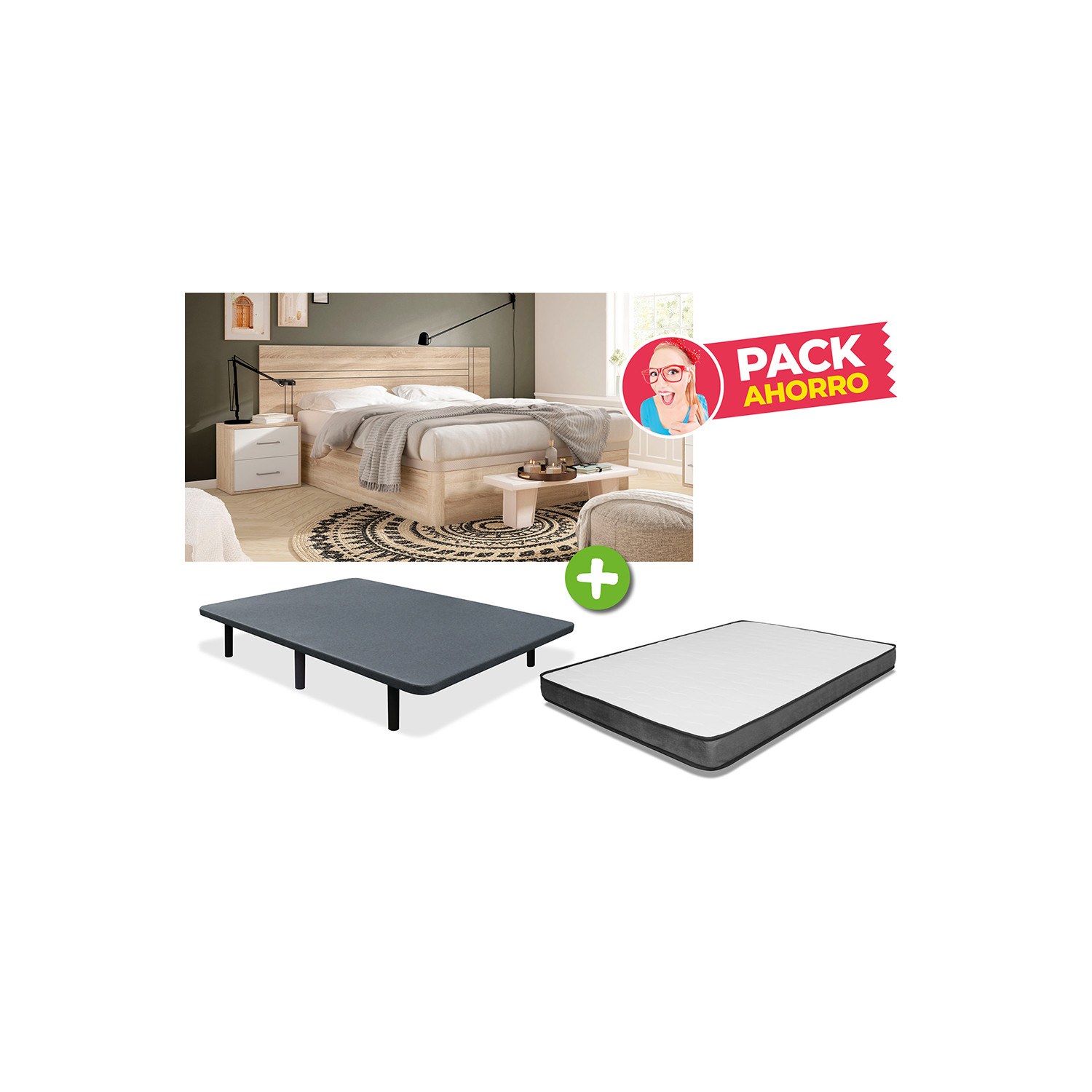 Pack ahorro de dormitorio de matrimonio compuesto por cabecero, dos mesitas, colchón, base tapizada y juego de patas de estilo nórdico a un precio muy económico.