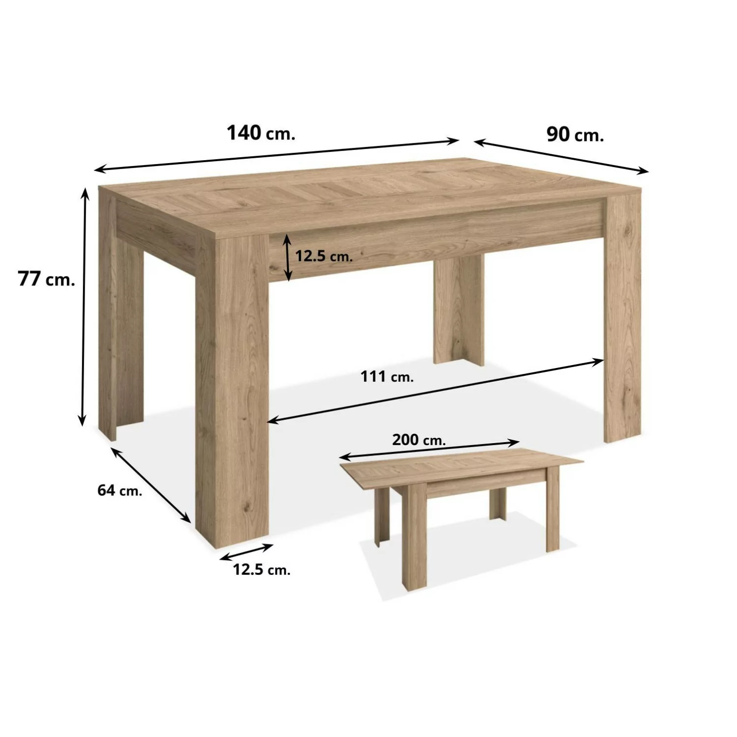 Este modelo de mesa comedor moderna y extensible está diseñada principalmente para la comodidad de los comensales al tener las patas en los extremos para que no molesten. Tiene una medida de 140 cm de ancho x 90 cm de fondo x 77 cm de alto y lleva un extensible oculto en su interior de 60 cm, al acoplarlo en la mesa nos dará una medida total de 200 cm para que puedan comer de 8 a 10 personas sin apreturas.