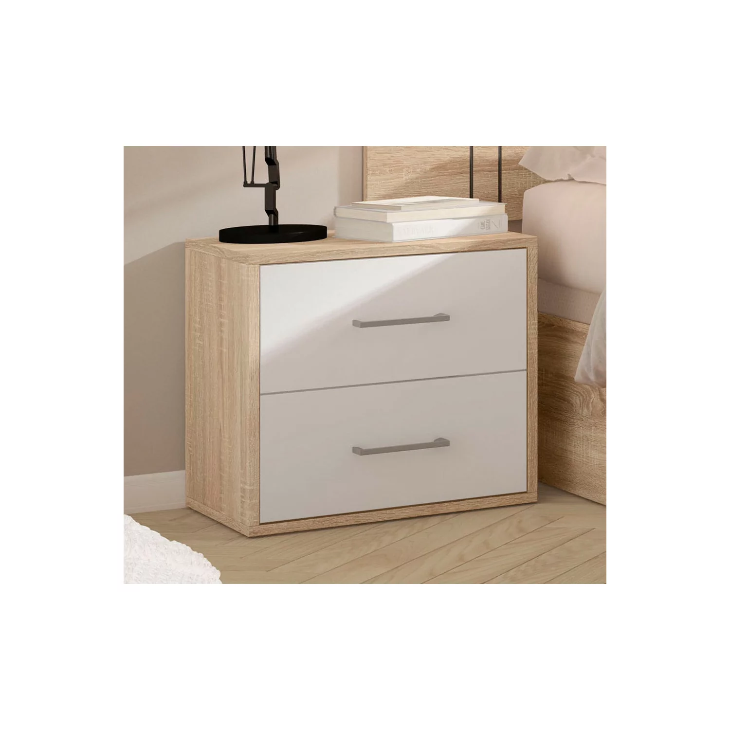 Mesita de noche en color cambrian combinada con cajones en blanco imprescindibles para un dormitorio completo. Se entrega montado.