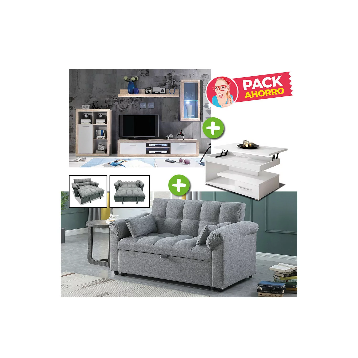 Pack ahorro salón Velázquez - Mueble librería salón + sofá cama + mesa centro elevable