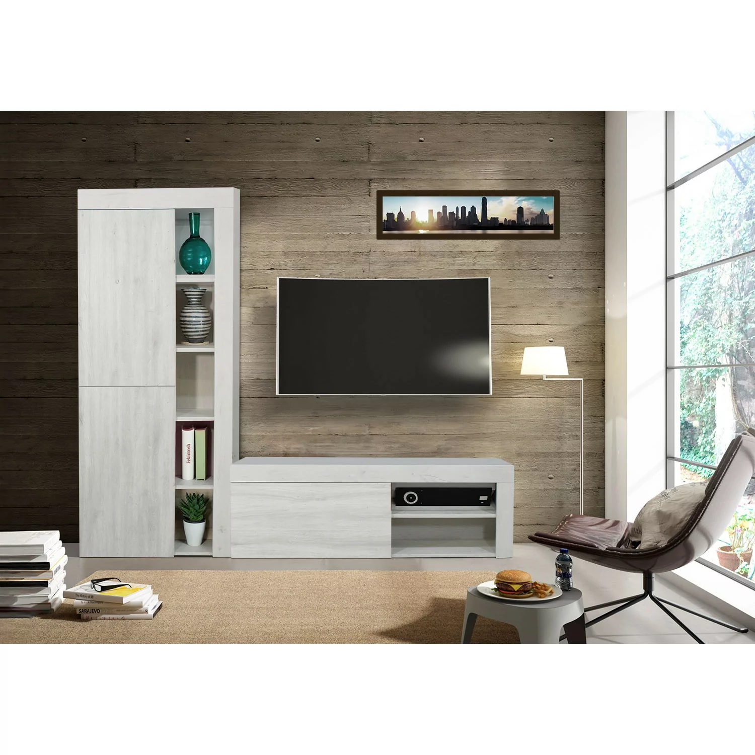 Este mueble de sala modelo Alonso consta de un módulo para televisión con un trampon abatible, y un hueco lateral con un estante para colocar tus aparatos electrónicos. A la izquierda, una vitrina alta con una puerta ciega y cuatro estantes.