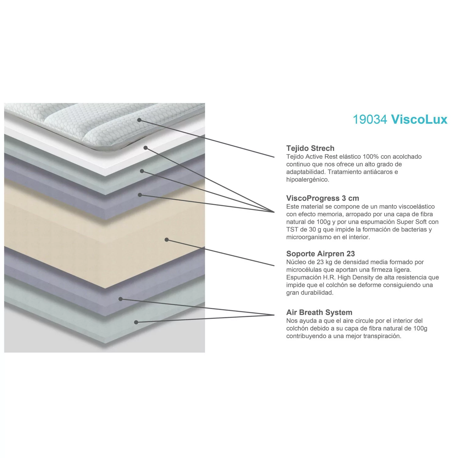 Colchón viscoelástico modelo Viscolux tapizado en su cara principal con tejido Strech hipoalergénico y antiácaros terminado en una altura total de 19 cm, este tejido es muy elástico, suave al tacto y facilita la transpiración evitando la aparición de bacterias y microorganismos que son nocivos para nuestra salud. Su interior está formado por un manto viscoelástico arropado por varias capas de fibras naturales de 100g y por una espumación de H.R. que permite que el colchón no se deforme y se adapte al peso de nuestro cuerpo.