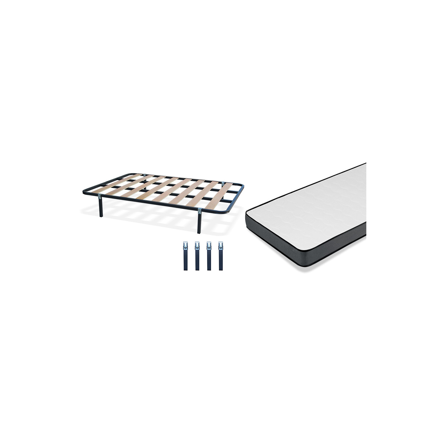Colchón 135x190 con somier con patas de la misma medida, un conjunto muy económico que te ofrece un buen descanso debido a sus láminas de madera reforzadas y al colchón silencioso sin muelles.