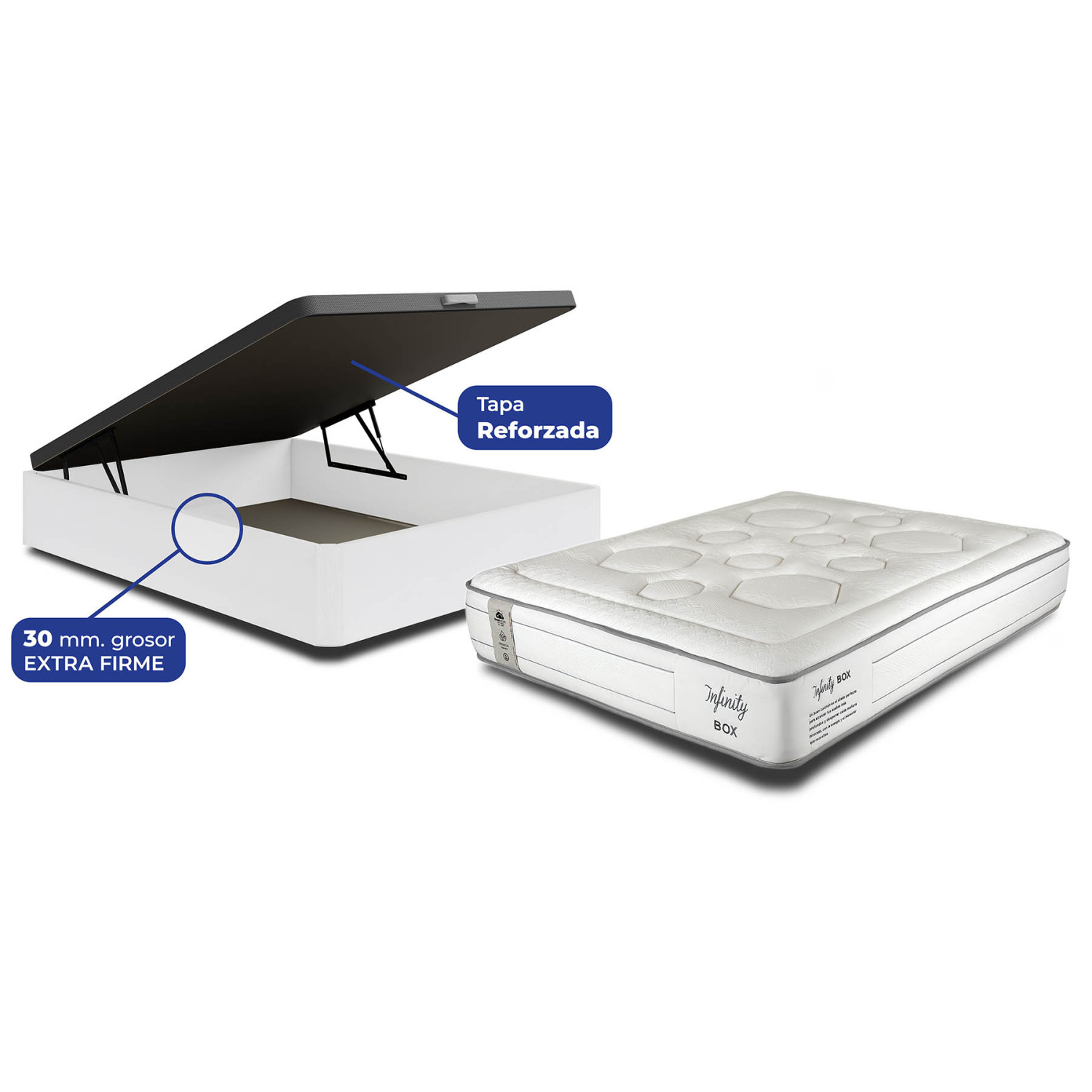 El pack de canapé blanco con colchón Infinity es una solución completa para quienes buscan una cama amplia, cómoda y con espacio de almacenamiento adicional. Este conjunto incluye el canapé Berlín abatible con tapa reforzada y con un cajón de 30 mm de grosor y gran arcón interior, junto al colchón Infinity Box de 32 cm con tecnología de muelles ensacados. Su diseño moderno en color blanco aporta luminosidad y combina fácilmente con cualquier dormitorio. El colchón proporciona independencia de lechos y una gran adaptabilidad al cuerpo. Un equipo de descanso funcional y duradero pensado para mejorar la calidad del descanso.