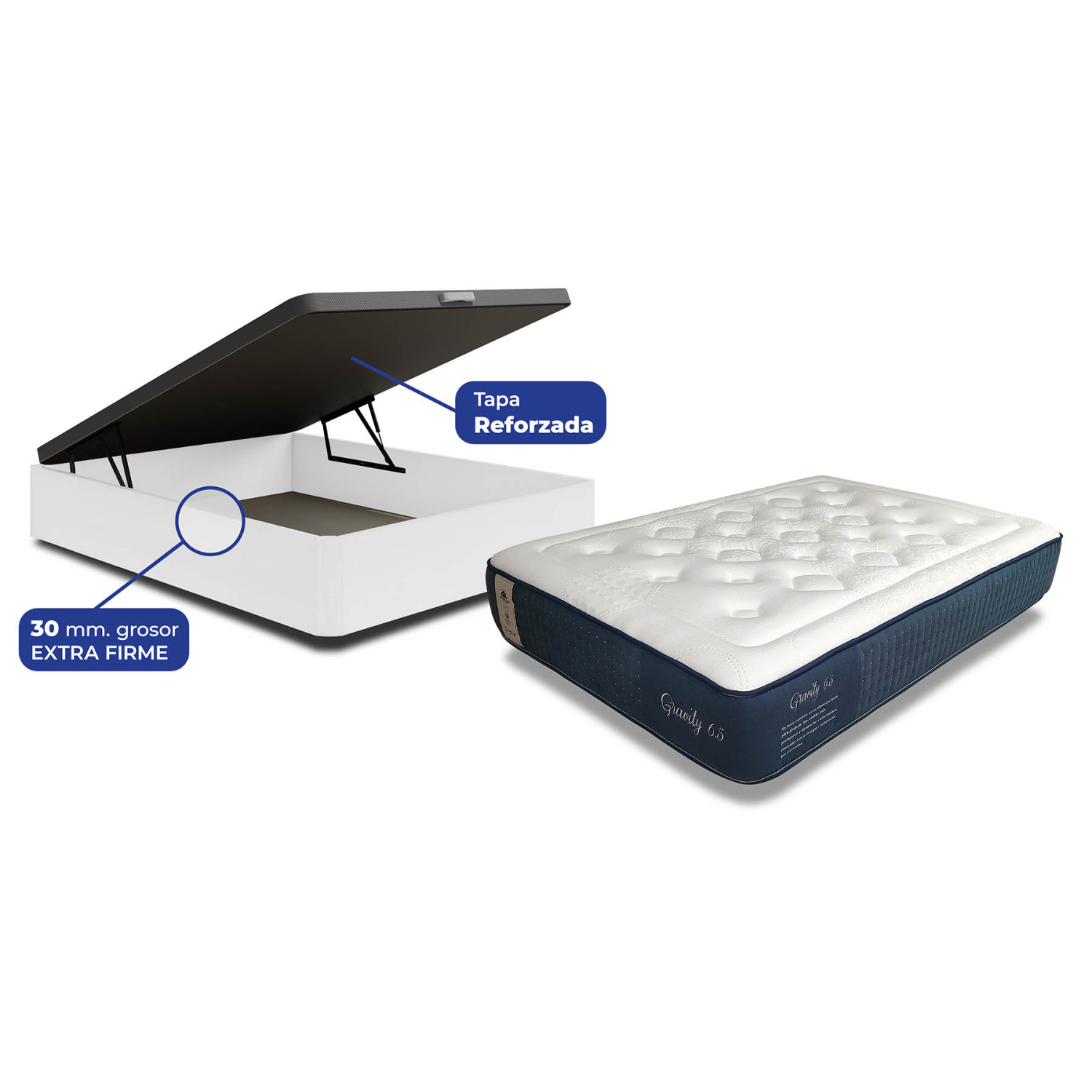 El conjunto de canapé blanco con colchón Gravity 135x190 cm es la opción ideal para quienes buscan mejorar su descanso y aprovechar al máximo el espacio del dormitorio. Este pack incluye el canapé Berlín con sistema abatible y gran capacidad interior de almacenamiento, combinado con el colchón Gravity 6.5 de 32 cm de altura con núcleo Foam Hydro Gel. Esta combinación proporciona un descanso confortable, adaptable y con buena ventilación.