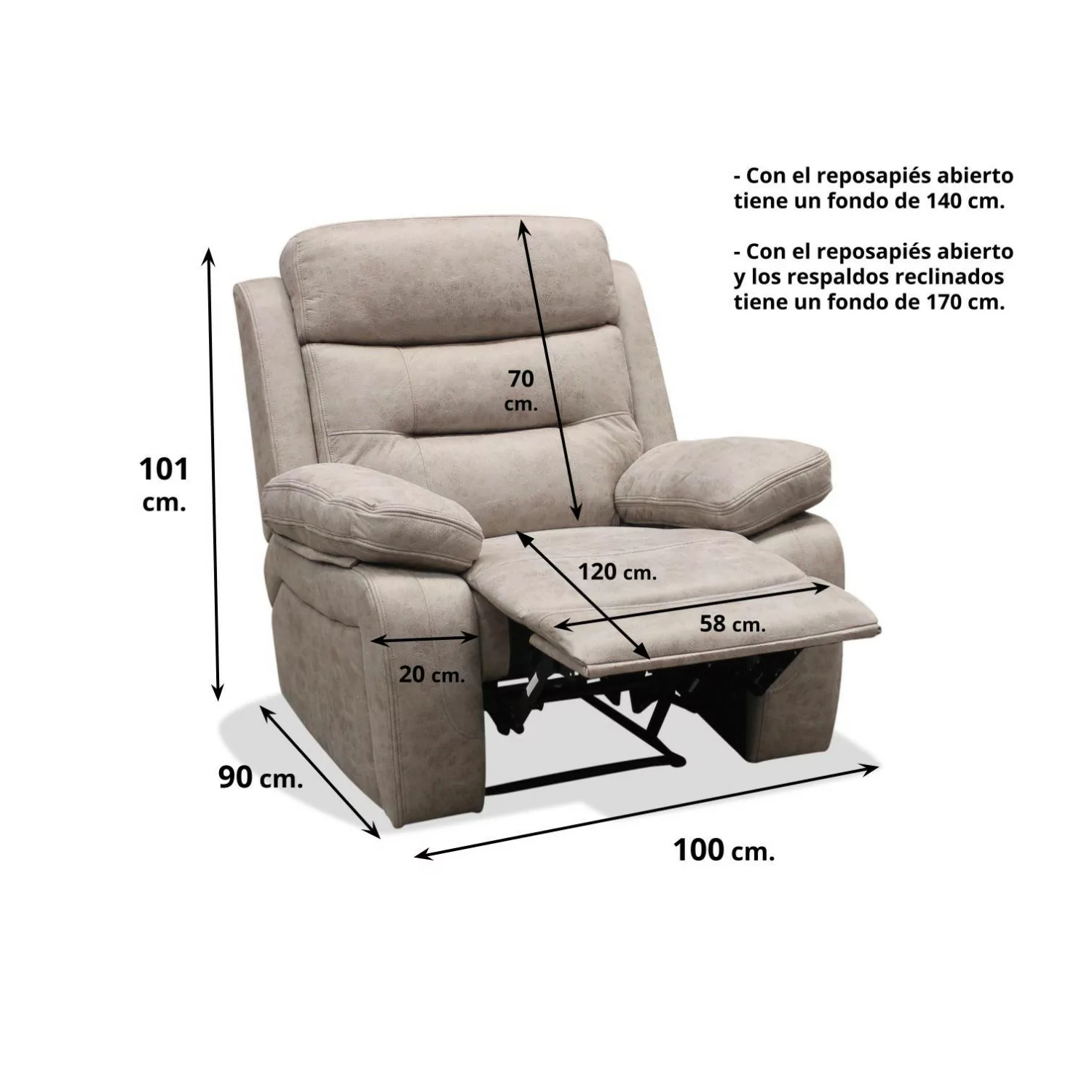 Está diseñado para brindarte un gran confort para que puedas experimentar una sensación de relajación y tranquilidad. Todo el sillón de descanso se apoya sobre una estructura de metal negro pintado con epoxi antioxidante. La apertura del sistema es muy sencilla, una vez que hemos accionado la palanca y sale la parte de las piernas sólo tenemos que poner las manos en los reposabrazos e inclinarnos hacia atrás, tendremos dos posiciones, una con los reposapiernas extendidos y otra con el respaldo echado hacia atrás. Cuando dejamos el respaldo plano, la profundidad total del sofá de relajación es de 160 cm. Este estupendo Sillón relax destaca principalmente por su alto grado de comodidad debido a los acolchados de su asiento y de su respaldo y está diseñado para que disfrutes al máximo de tus momentos de descanso, no te imaginas lo cómodo que es hasta que lo pruebas.