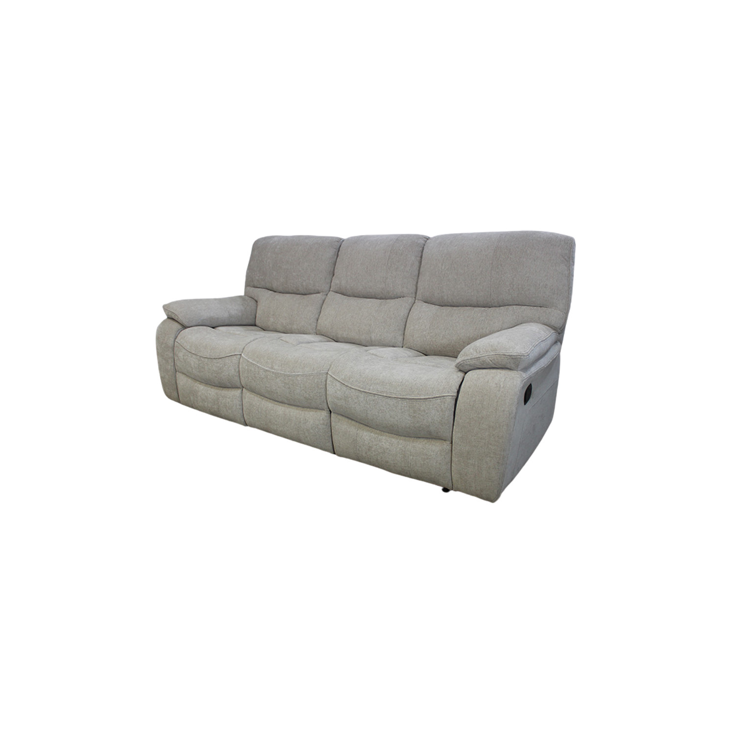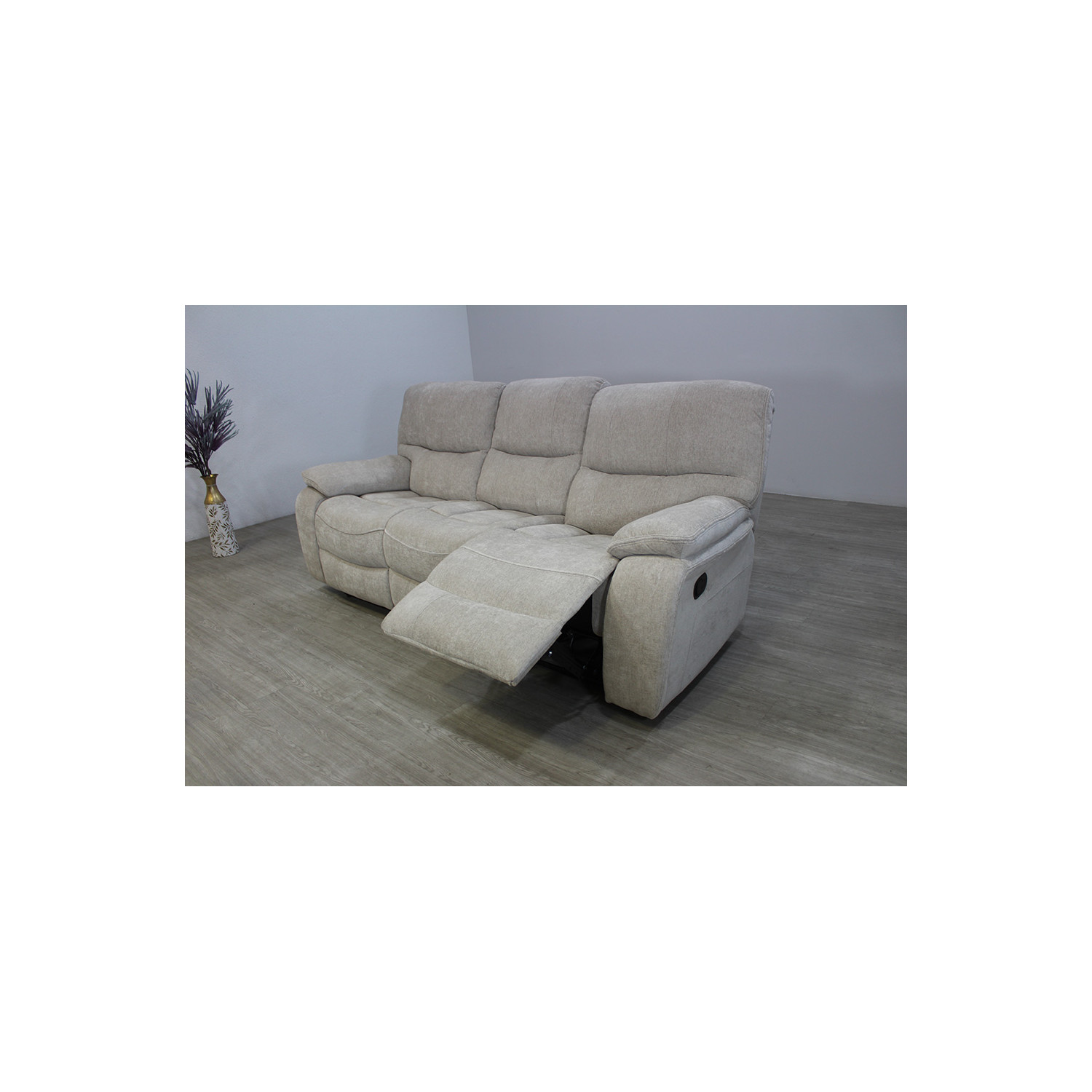 El sofá de tres plazas reclinable manual cuenta con un sistema que permite elevar las piernas y reclinar el respaldo únicamente en las plazas de los extremos. Es importante destacar que la plaza del centro no dispone de sistema de reclinación. Este sofá tres plazas reclinable en color beige no solo se enfoca en la comodidad, sino también en la elegancia. Su estructura robusta y su tapizado de alta calidad lo convierten en una pieza imprescindible para cualquier sala de estar. Los reposabrazos anchos y acolchados añaden un extra de confort, mientras que su estilo moderno y versátil se integra perfectamente en cualquier tipo de decoración.