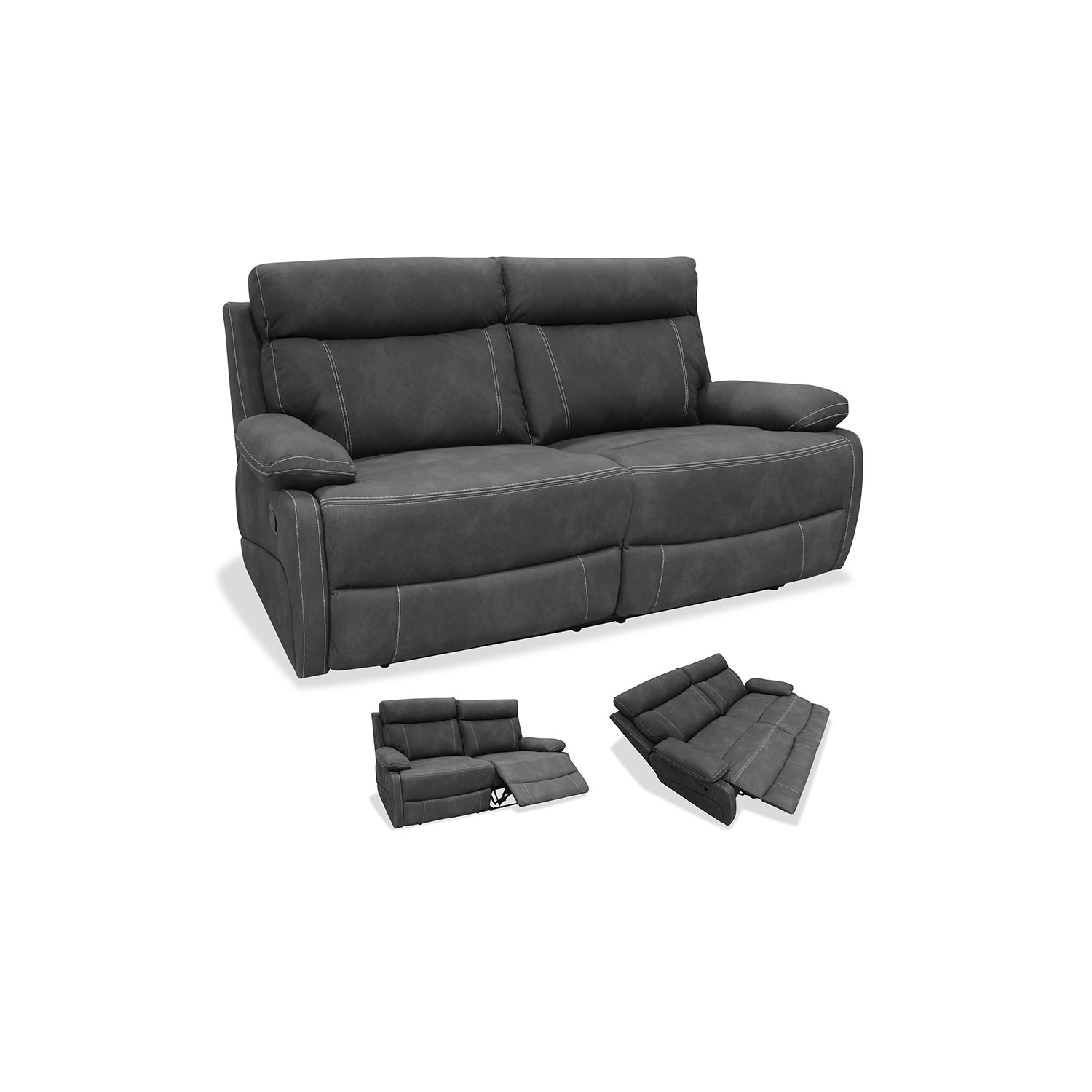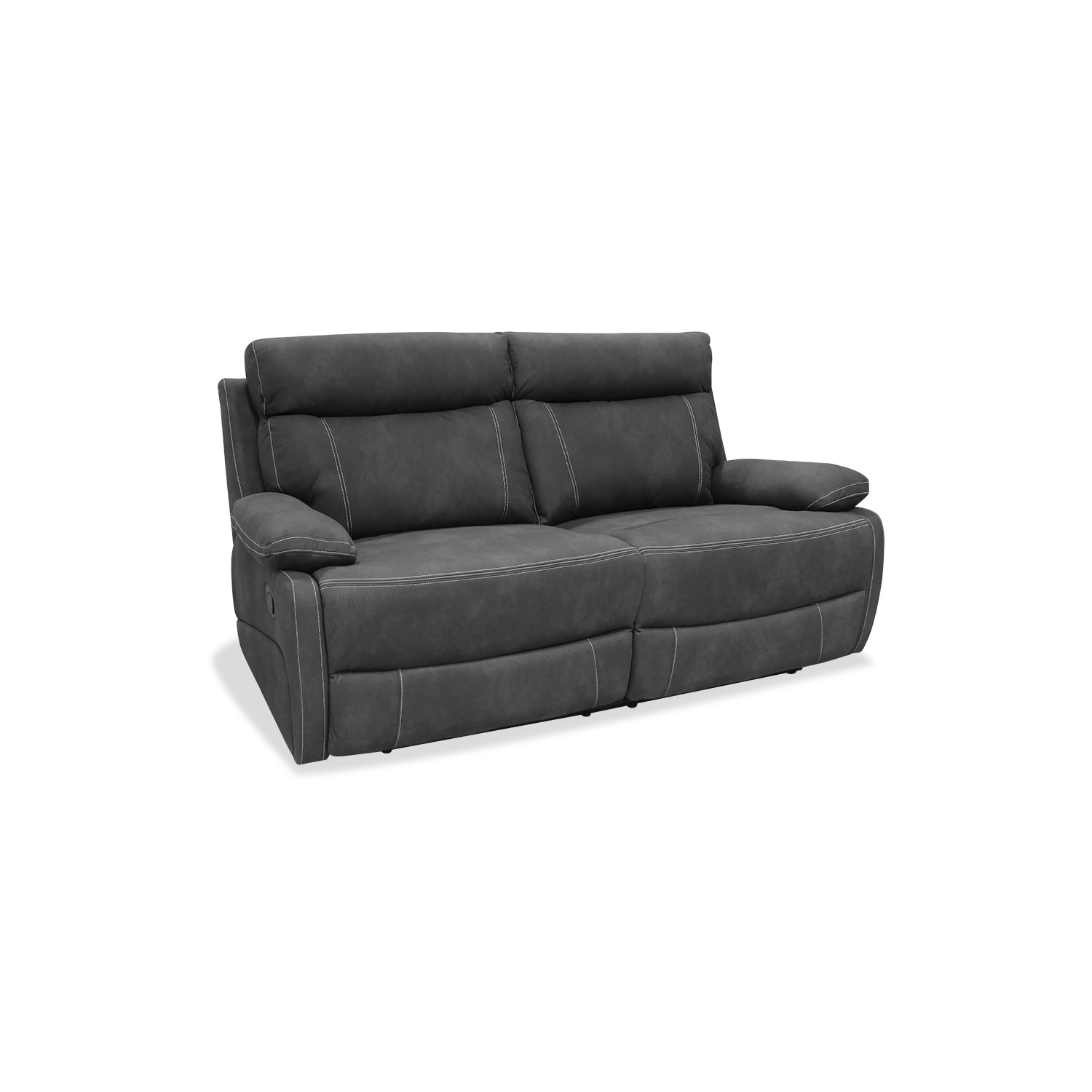 Sofá relax manual de dos plazas tapizado en color gris oscuro. Su estructura sólida y su excelente relación calidad-precio lo hacen perfecto para todo tipo de estancias. Cada asiento cuenta con función de reclinación independiente mediante sistema manual de palanca.