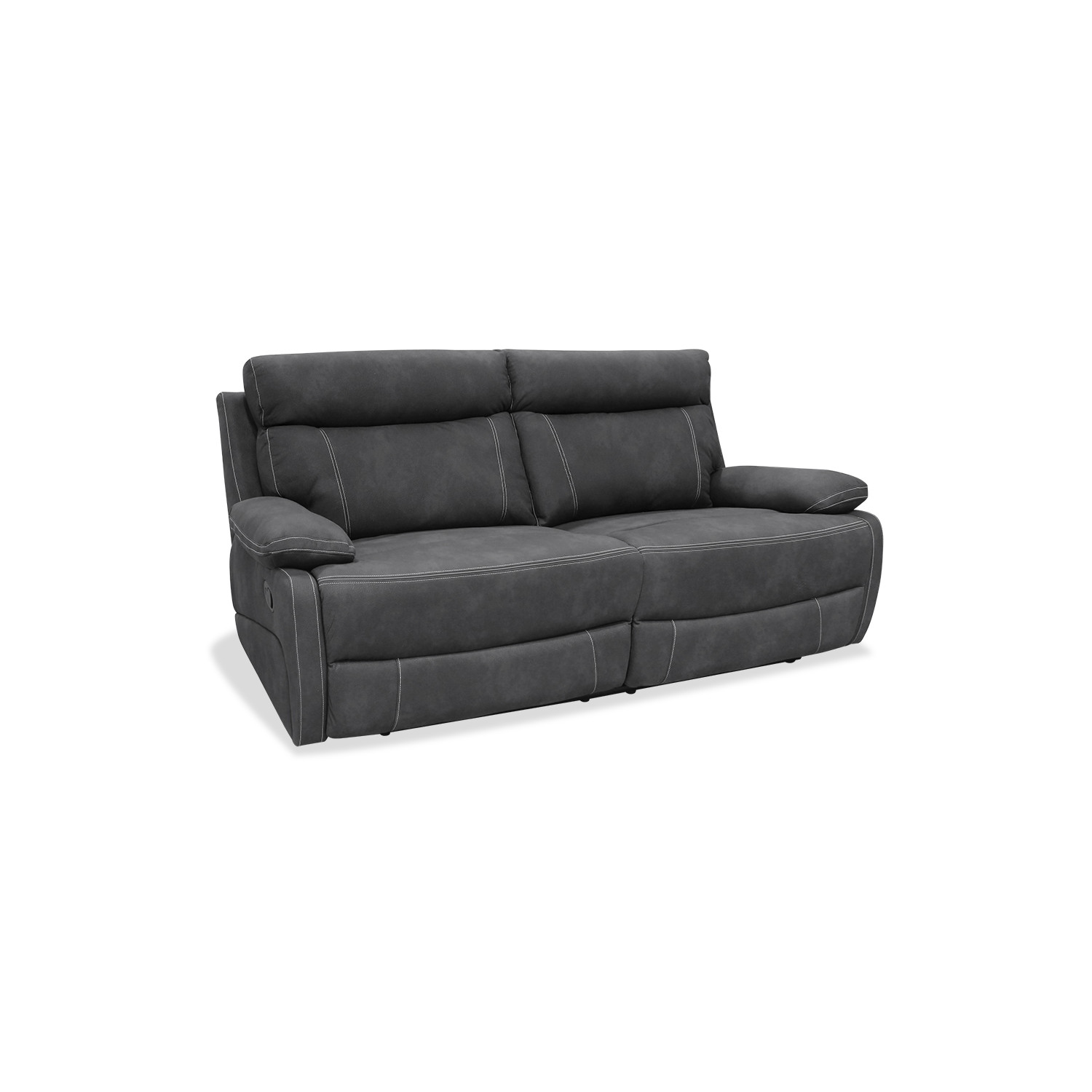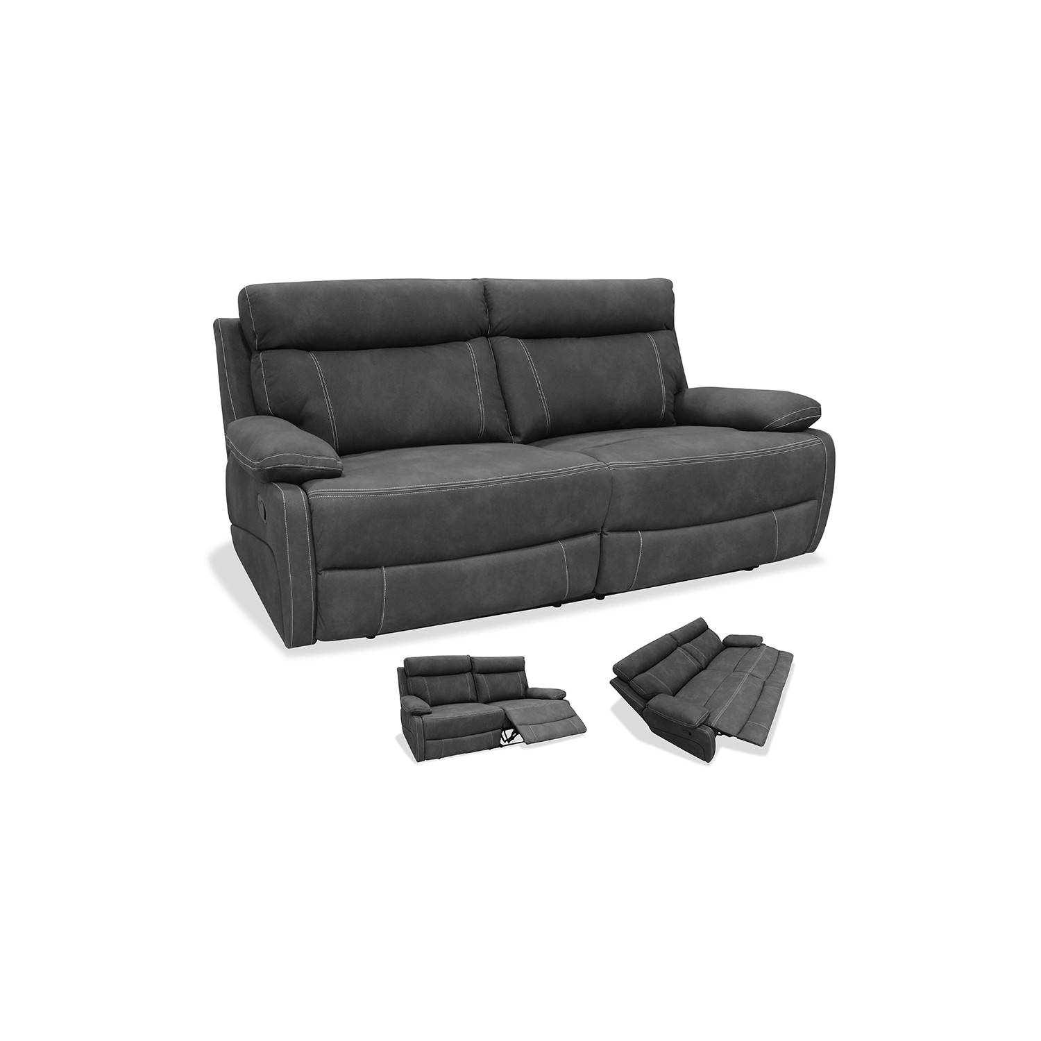 Sofá relax 3 plazas con dos asientos XL extra anchos tapizado en color gris oscuro. Cuenta con dos grandes asientos reclinables de forma independiente mediante palanca manual situada en el lateral del sofá, ofreciendo máxima comodidad y espacio. Ideal para quienes buscan amplitud, confort y estilo en un mismo mueble.