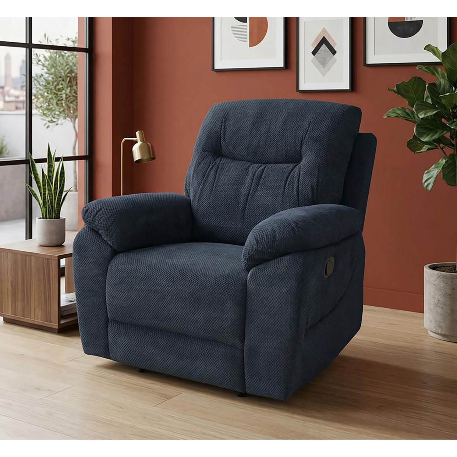 El sillón relax diseño Módena en color dark blue está diseñado para quienes buscan un asiento realmente cómodo sin renunciar a un estilo elegante y moderno. Gracias a su sistema reclinable manual podrás estirar las piernas fácilmente y disfrutar de un descanso perfecto mientras lees, ves la televisión o simplemente te relajas en casa.