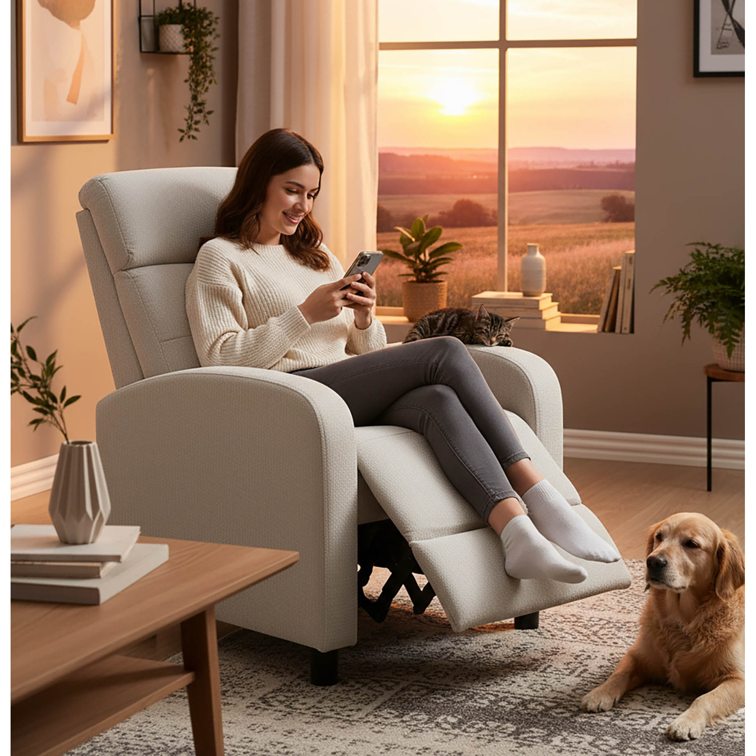 El sillón relax modelo Boom Hawai en acabado beige combina diseño moderno, tamaño compacto y una comodidad excepcional. Gracias a su sistema reclinable manual push back, podrás inclinar el respaldo con un ligero empuje y elevar el reposapiés para disfrutar de una posición casi horizontal perfecta para desconectar después de un largo día.