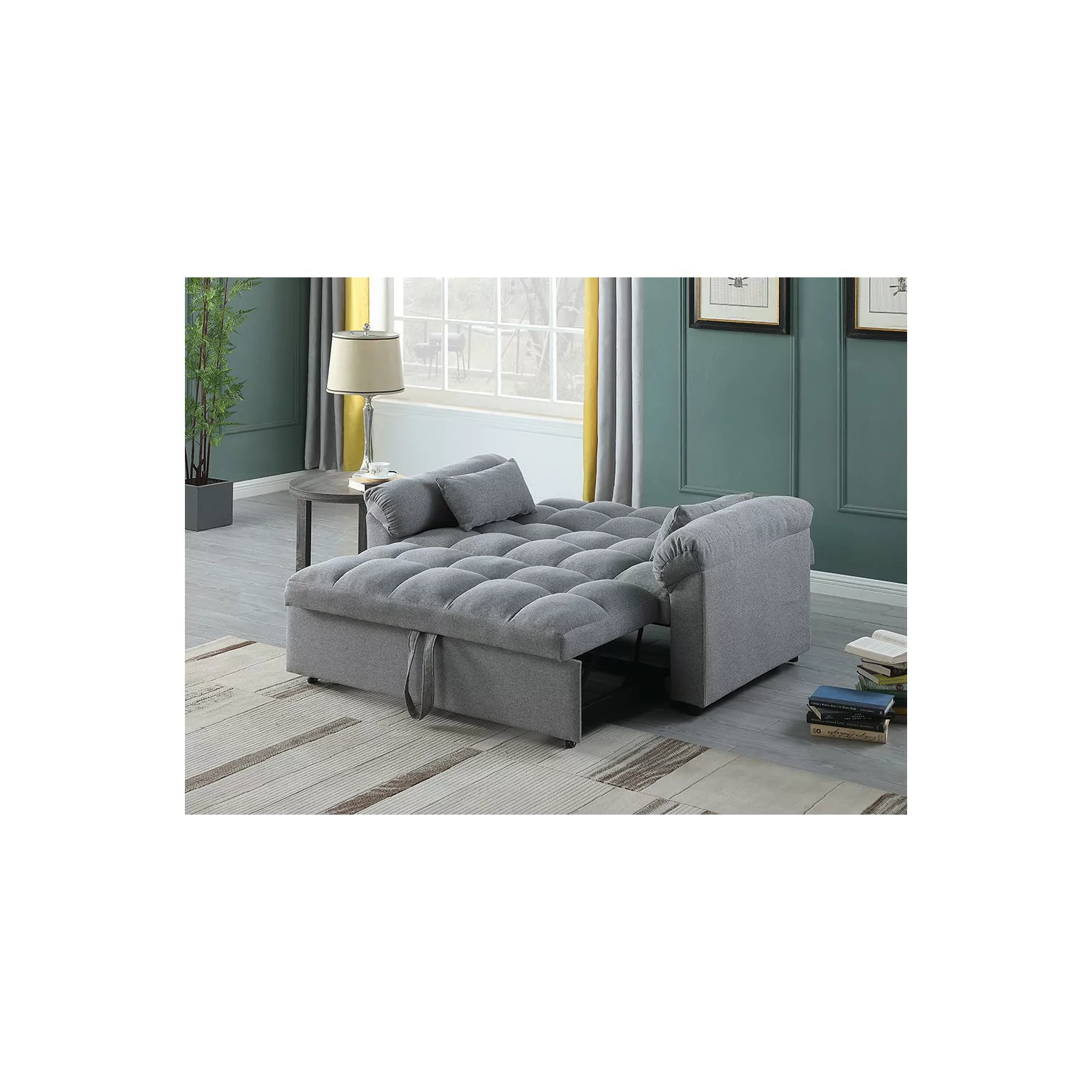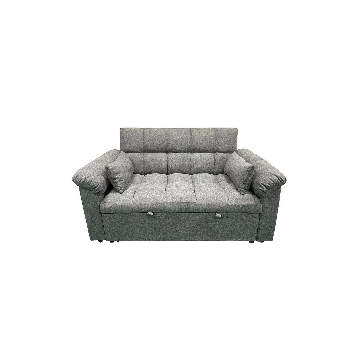 Sofá cama matrimonial en color gris con sistema de arrastre y clic clac. Experimenta la comodidad y la funcionalidad con nuestro sofá Oliver que se transforma en cama en cuestión de segundos. Su mecanismo de cama extraíble y el respaldo reclinable mediante clic clac hacen que la transformación a cama sea fácil y sin esfuerzo. Cojines incluidos.