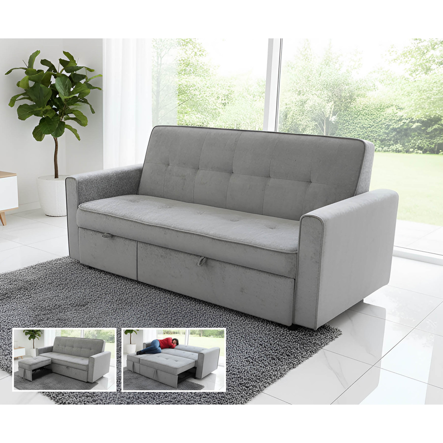 · Diseño moderno: Línea contemporánea con acabado capitoné en respaldo y asiento.· Tela suave al tacto: Acabado similar al terciopelo, lujoso y acogedor.· Funcional y versátil: Ideal para salones pequeños o espacios multifuncionales.· Confort garantizado: Estructura robusta y tapizado ergonómico para máximo relax.· Perfecto para visitas: Se transforma en una cama amplia y cómoda en minutos.· Sistema convertible en cama con sistema clic-clac y de arrastre mediante ruedas