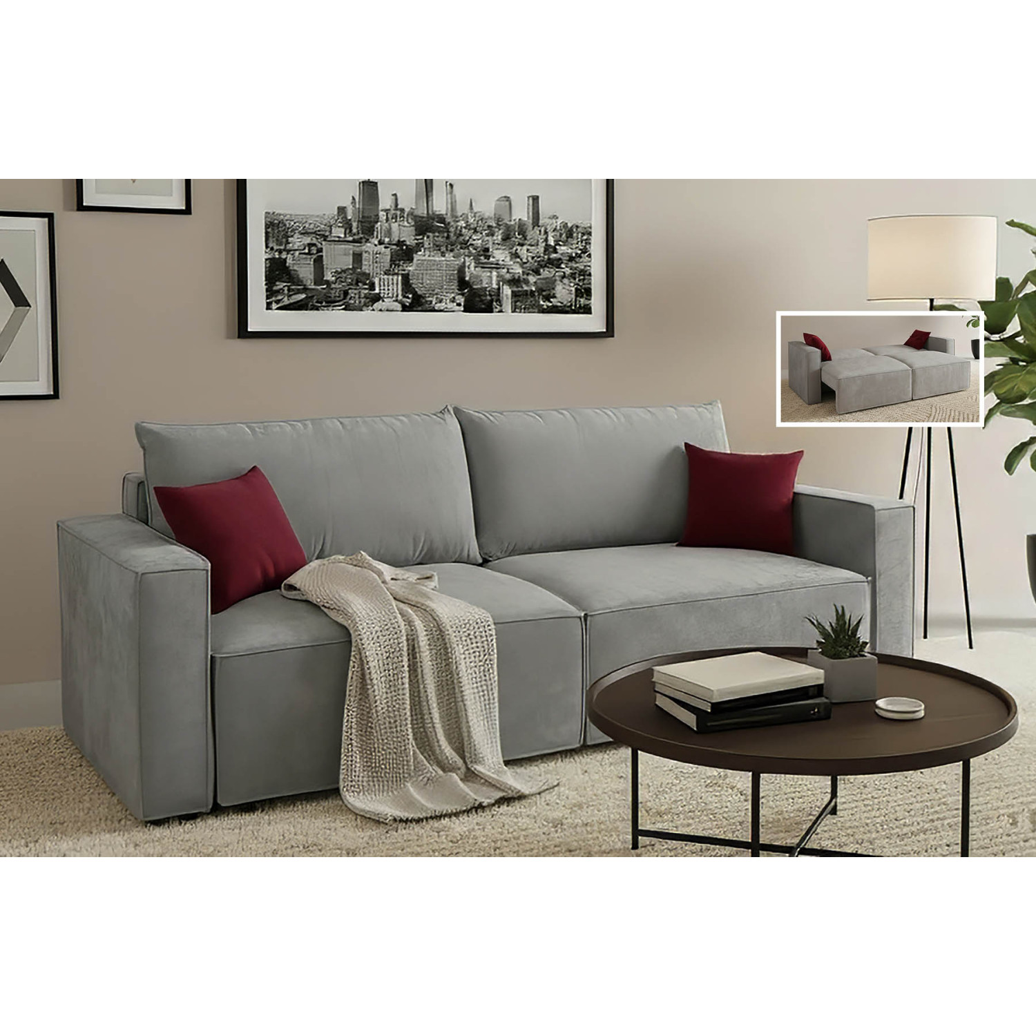 Está tapizado en tejido 100% poliéster, resistente y agradable al tacto, ideal para el uso continuo. Su tono gris aporta elegancia y versatilidad decorativa. Los cojines decorativos que aparecen en la imagen no están incluidos. Este modelo es perfecto para quienes desean optimizar el espacio sin renunciar al confort y al estilo en su hogar.