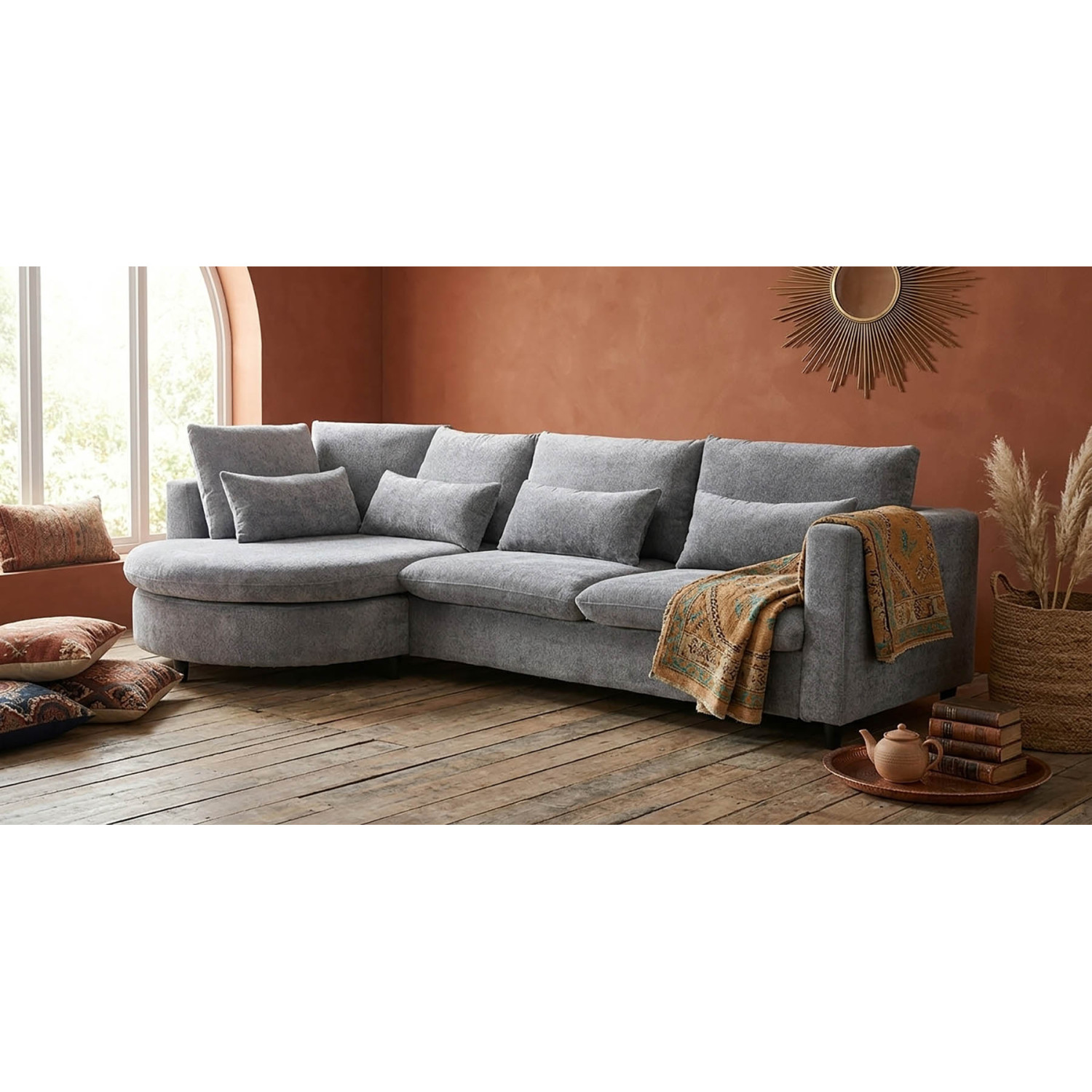 Echa un vistazo a esta chaise longue moderna y elegante en color gris vista de frente izquierda , la solución perfecta para quienes buscan estilo, comodidad y funcionalidad en un solo mueble. Con su diseño redondeado, esta chaise longue se convierte en una cama en segundos, ideal para salones espaciosos. Cojines decorativos incluidos. También la tienes disponible con la parte más larga vista de frente a la derecha .