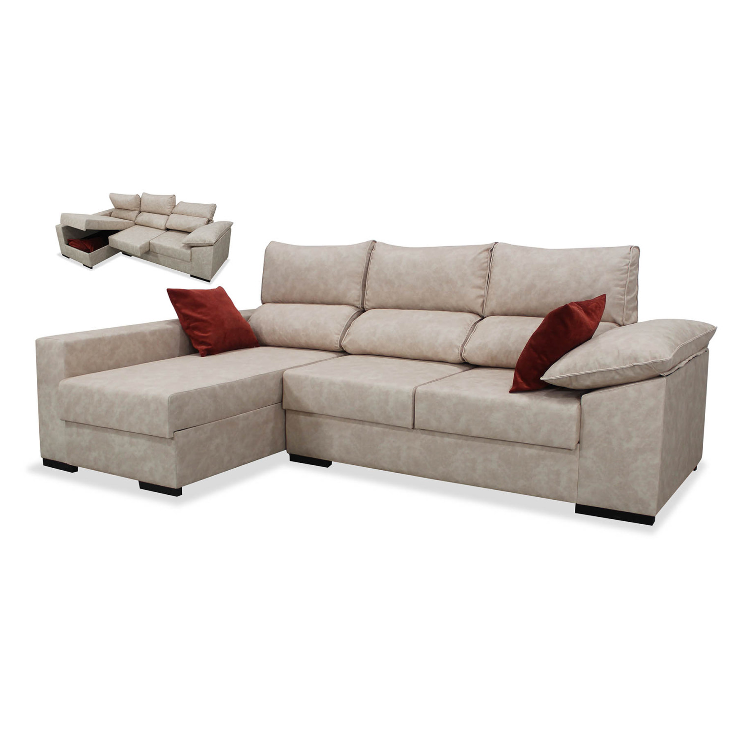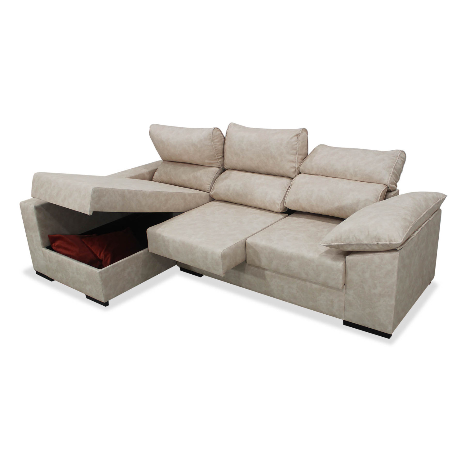 Sofá chaise longue izquierda California con arcón abatible, respaldos abatible y asientos deslizantes. Ideal para tu salón, aprovecha cada rincón con el máximo confort y relájate. Cojines decorativos opcionales.