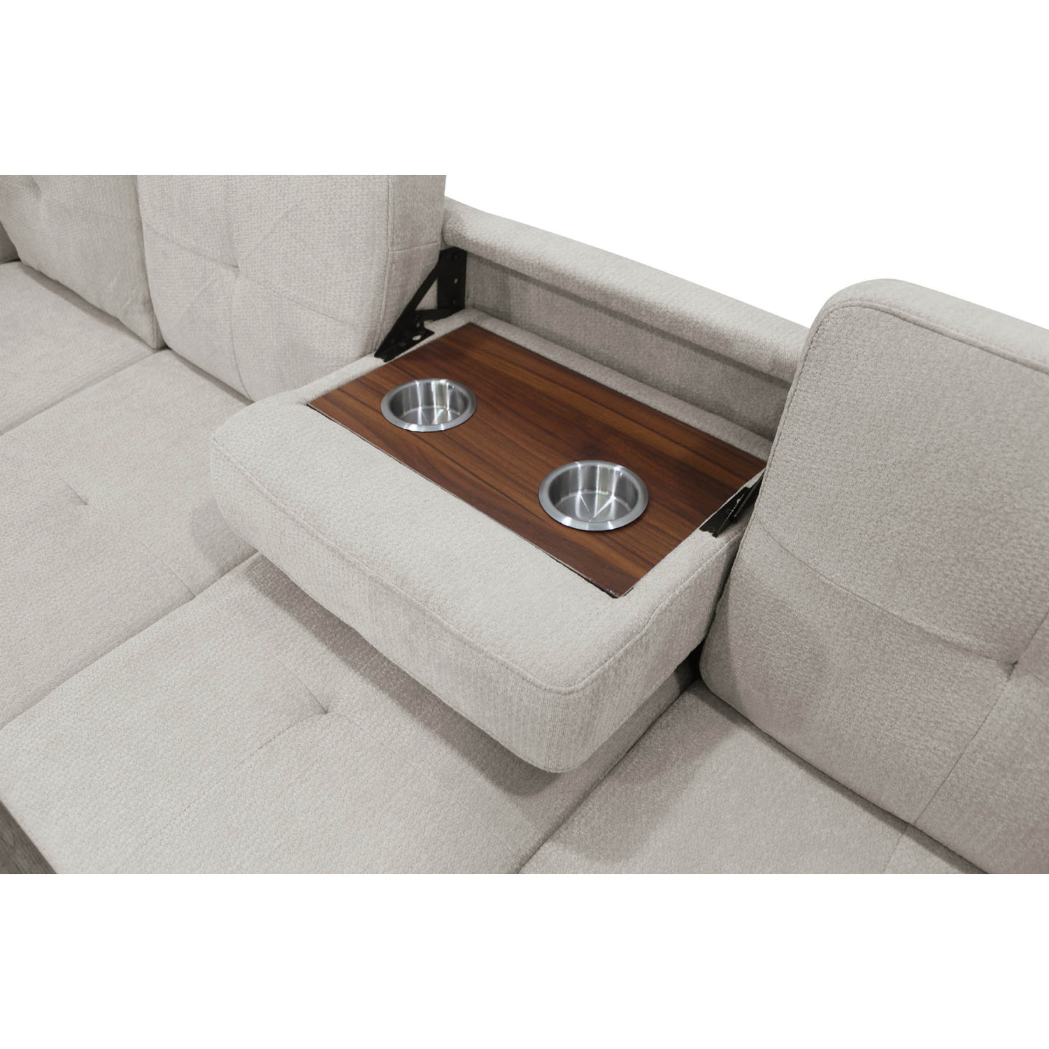 Uno de los grandes atractivos de esta rinconera con chaise longue izquierda es su respaldo abatible, que integra una práctica bandeja con dos posavasos. Ideal para apoyar bebidas o pequeños objetos mientras disfrutas de una película o una reunión en casa.
